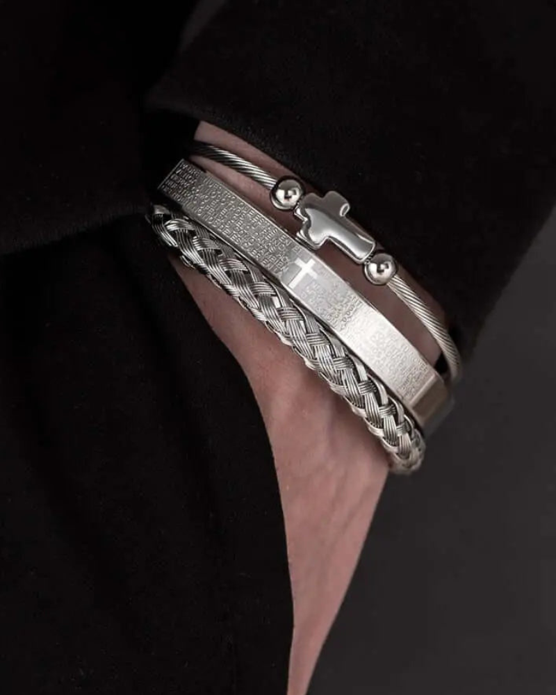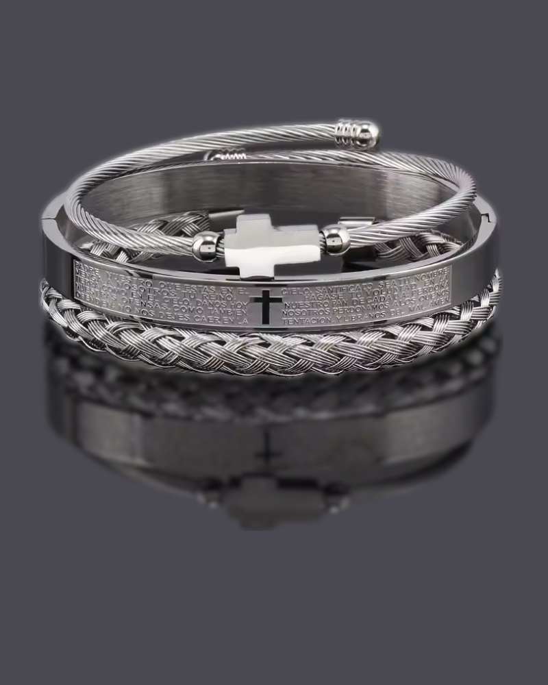 The Celestial Cross Bracelet Set combines timeless faith with modern sophistication. Crafted from durable stainless steel in radiant gold or sleek silver tones, each bracelet is adorned with Cubic Zirconia stones for a refined sparkle. Featuring a cross centerpiece and a Spanish-engraved Scripture bangle, this 3-piece set carries both elegance and meaning, making it perfect for daily wear or as a meaningful gift.
