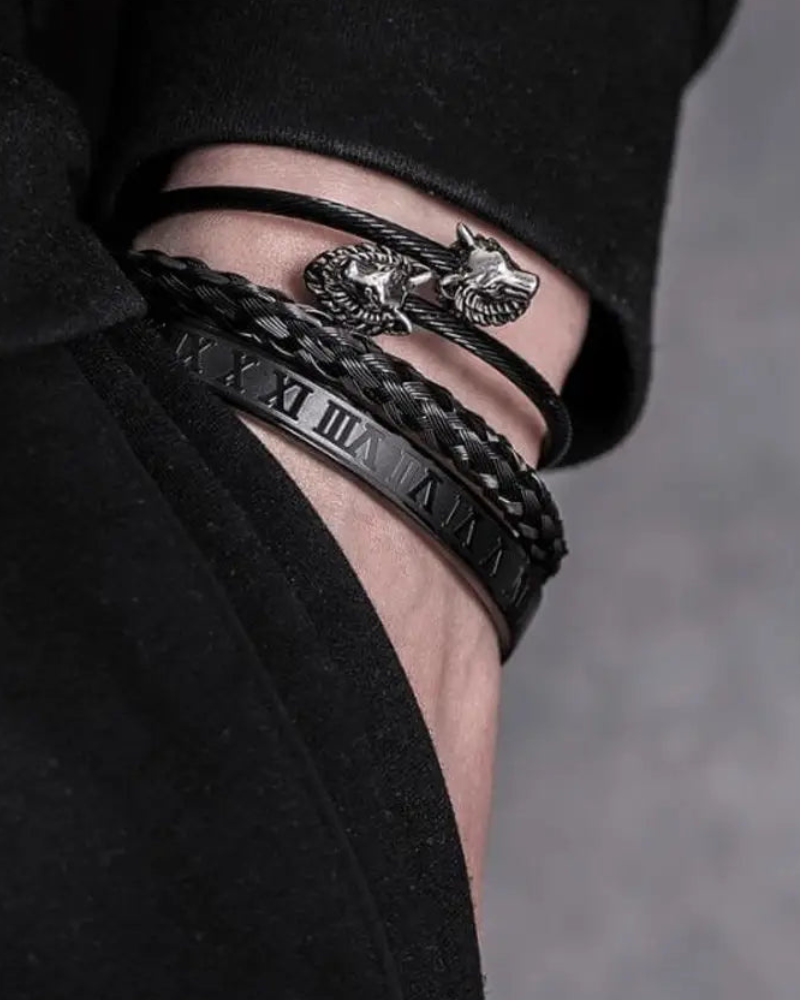 The Wolf Deluxe Bracelet Set captures the spirit of loyalty, protection, and freedom. Crafted in high-polished gold, silver, or black plated stainless steel, these bracelets promise enduring quality and vibrant shine, making a powerful statement in any setting.