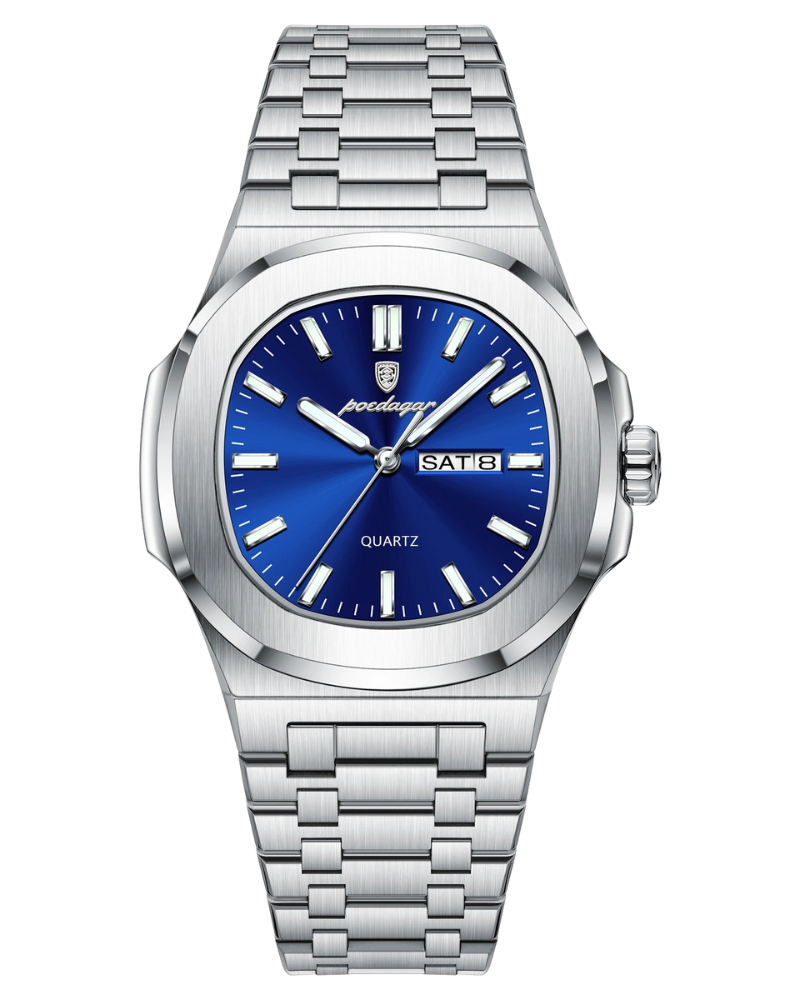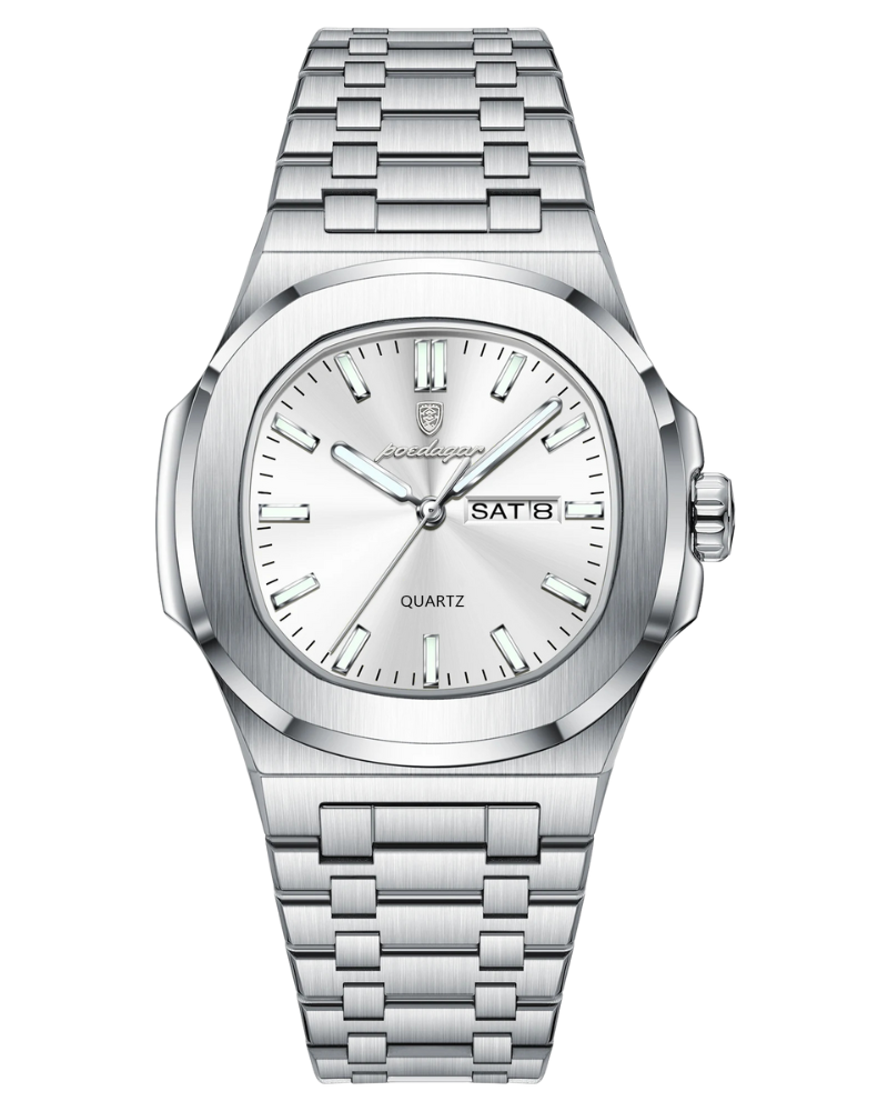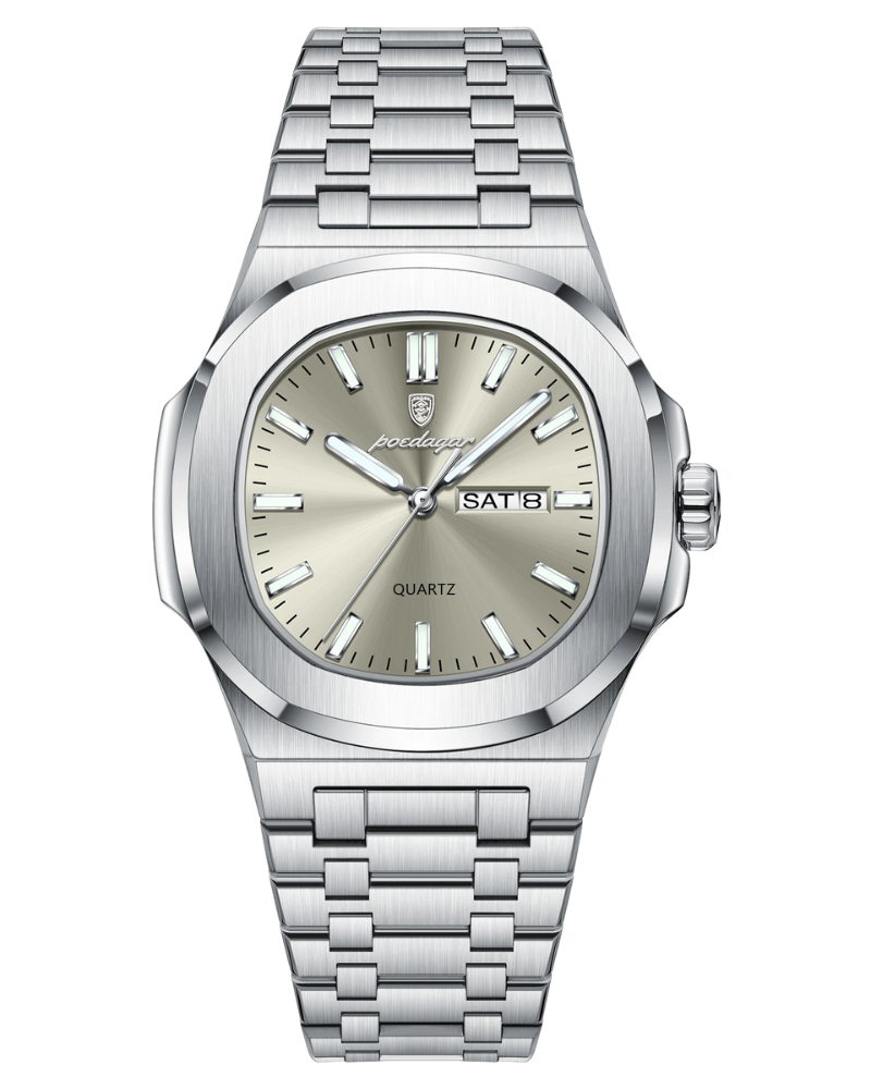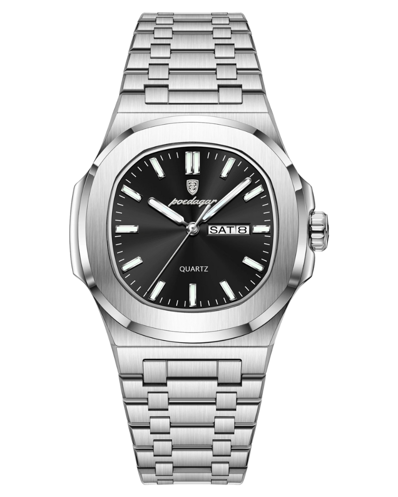 With its bold square case and minimalist needle display, the Legacy Edge is made to stand out. Crafted from stainless steel and built with luminous hands, water resistance, and a full week display, it merges clean aesthetics with reliable performance — perfect for those who lead with style.