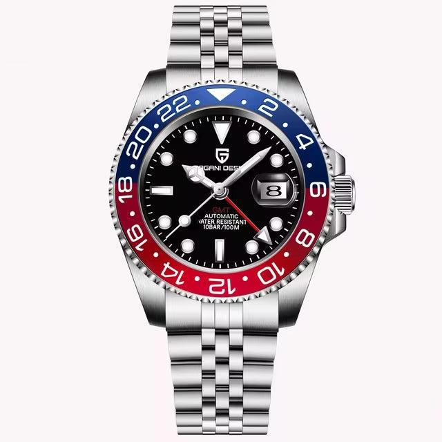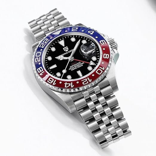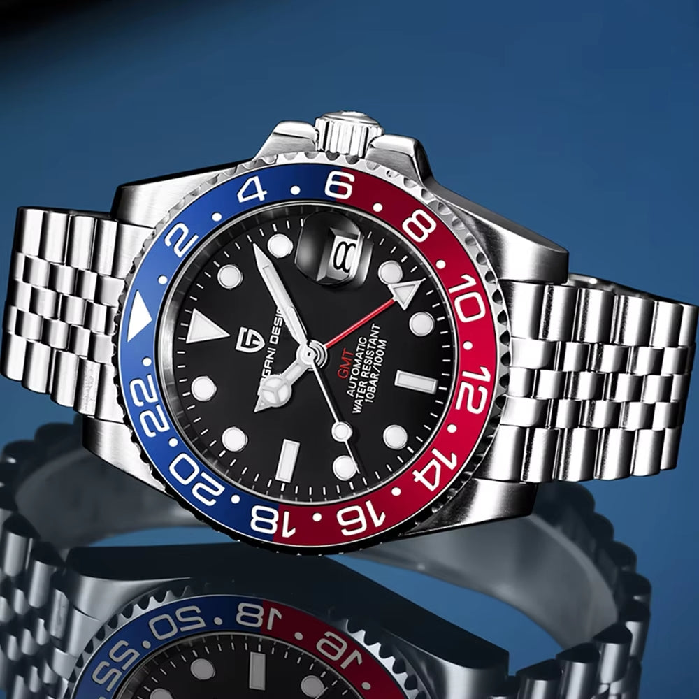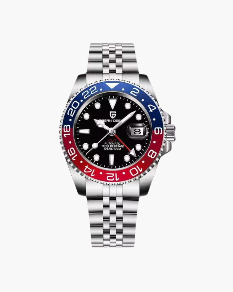 Featuring an automatic GMT movement with dual time zone capabilities, this exceptional timepiece keeps you synchronized wherever you go.